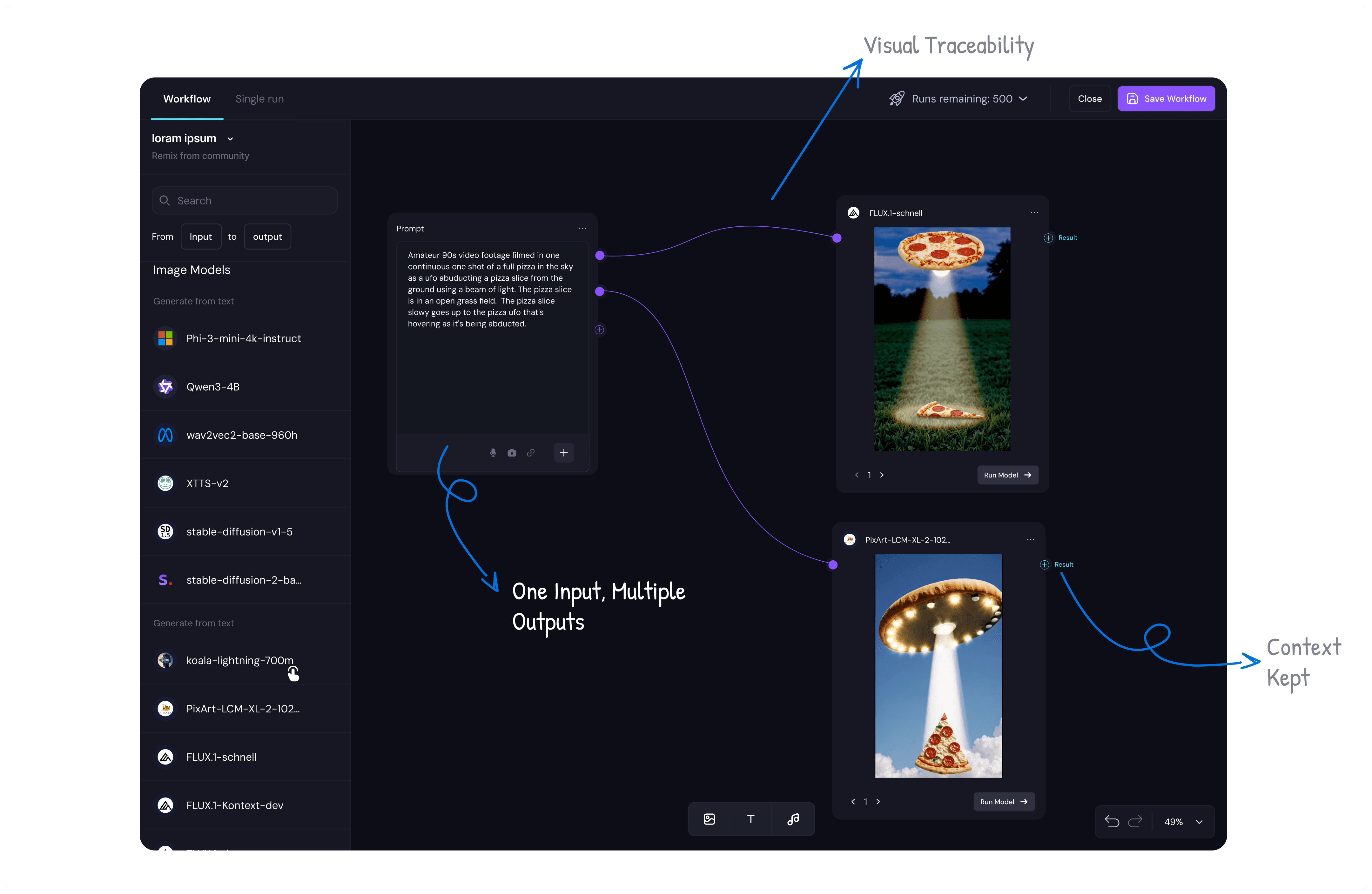 One Input, Multiple Outputs: Users can connect a single prompt to several models at once.