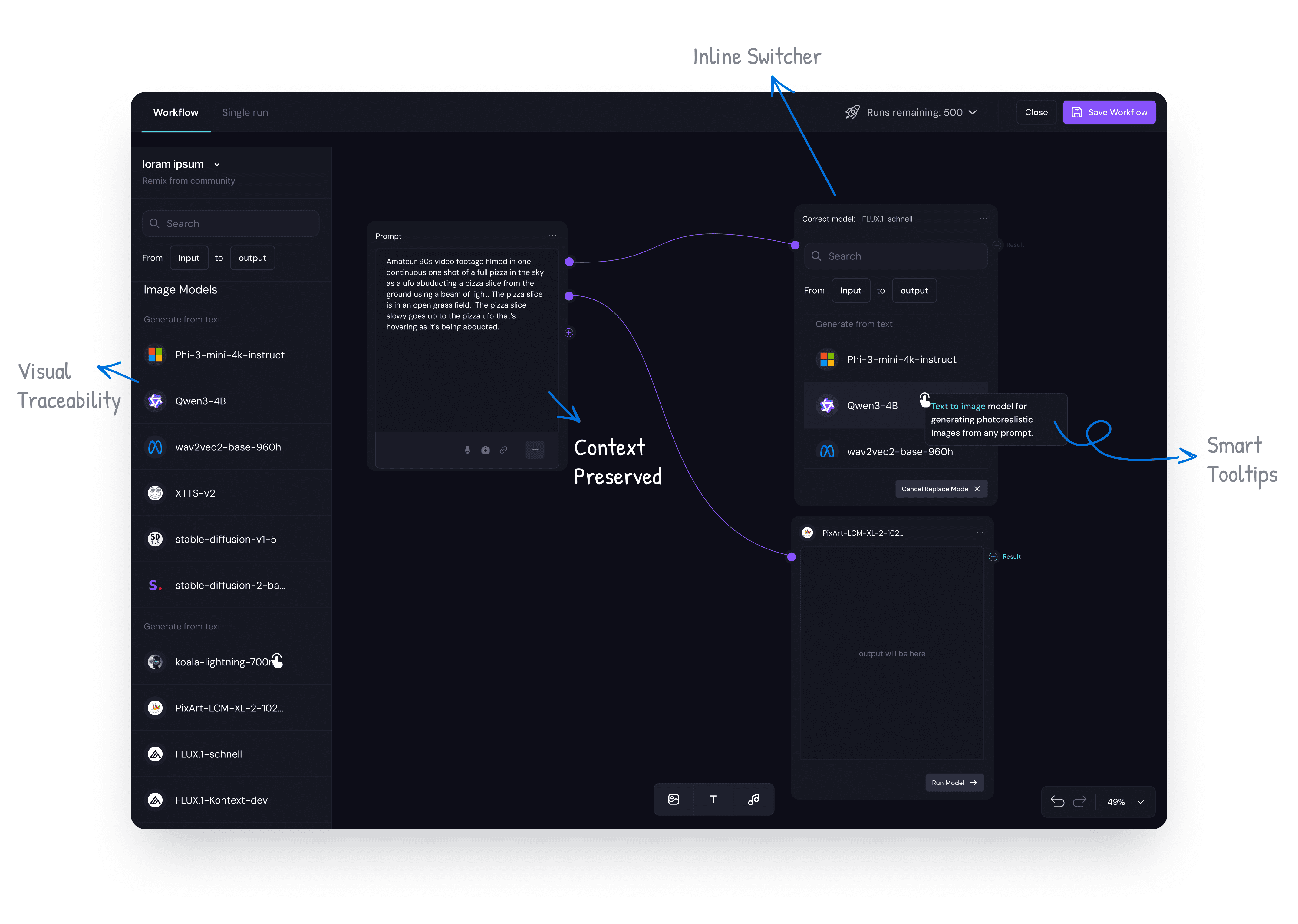 Inline Switcher: Users can swap models directly on the canvas without deleting their work.